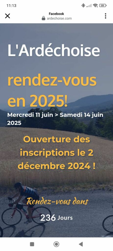 Projet ardéchoise 2025 ? Publié le 21 octobre 202421 octobre 2024 par admin4803 Notre ami Pierrot est chaud…pour l ardéchoise 2025! Rapprochez vous de lui si vous avez froid ou si ce projet vous intéresse aussi ! 😃 Toutes les infos sur le site de l ardéchoise : https://www.ardechoise.com/